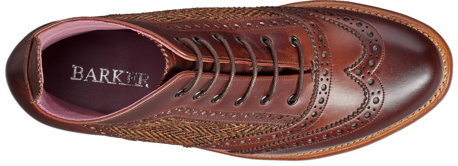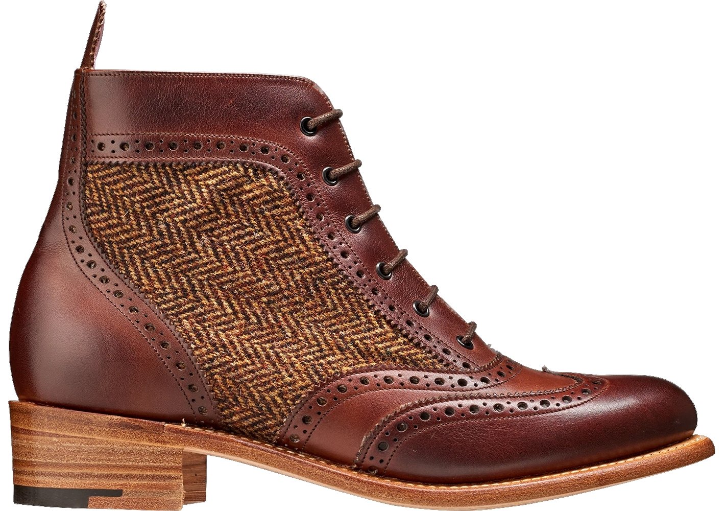 This Barker Grace 6 eyelet brogue ankle boot (ref. 719344) has a walnut calf leather upper with brown Harris tweed inserts.