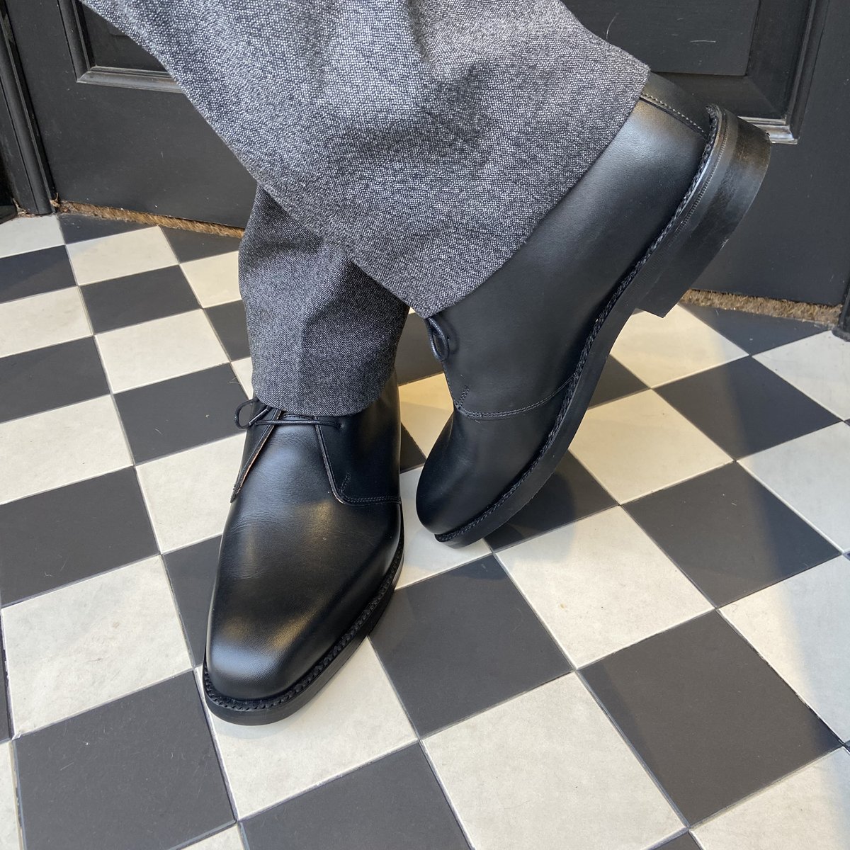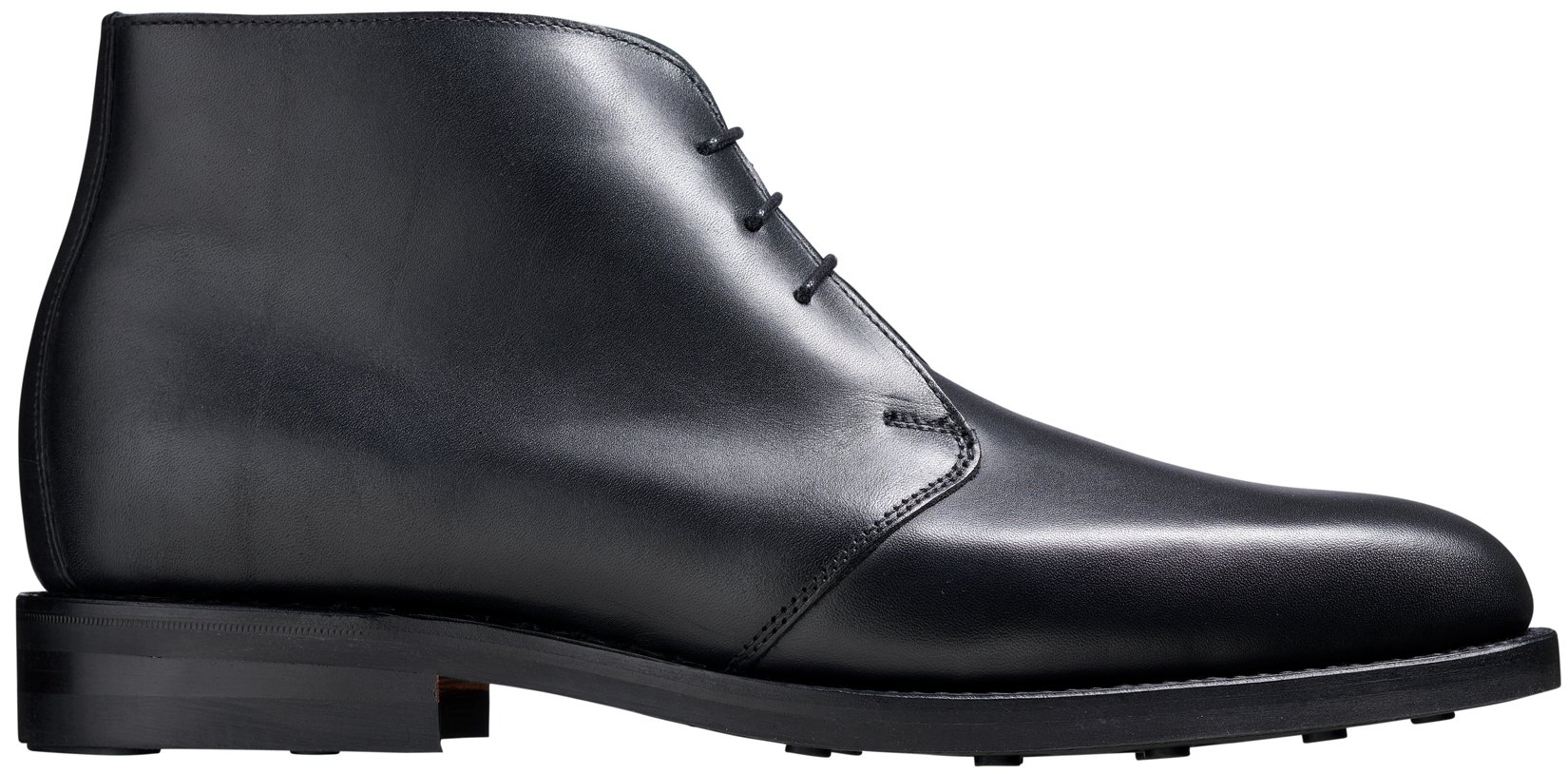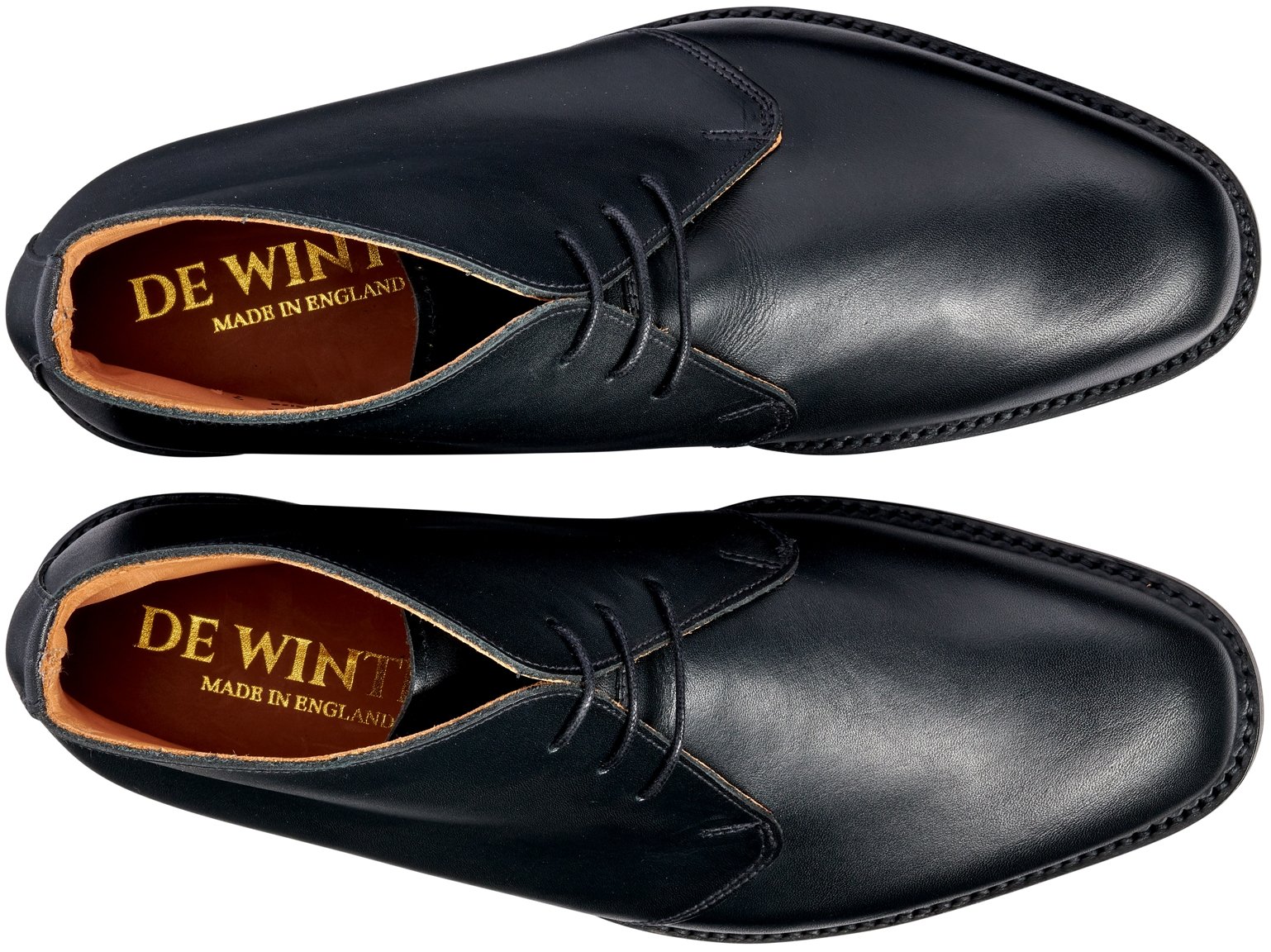 This version of the De Winter Warwick three eyelet chukka in full grain black waxed calf leather has an all black thru sole and heel block. Premium calf leather linings and leather welt with durable stud rubber soles. Made entirely in England.