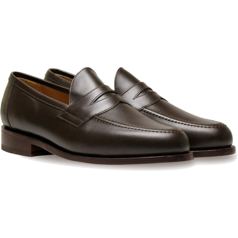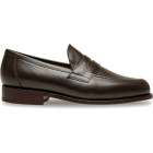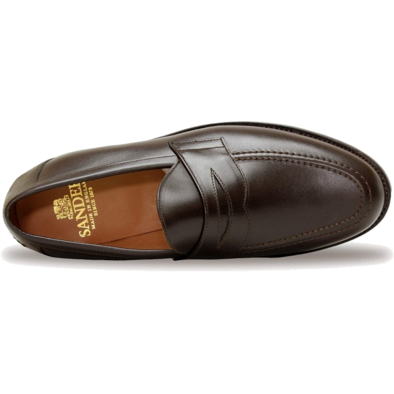 These Sanders Aldwych penny loafers are made on the regular medium wide F fitting Matt last. This style no. 8128TD has a dark brown full grain calf leather upper.  These shoes are made entirely in England.