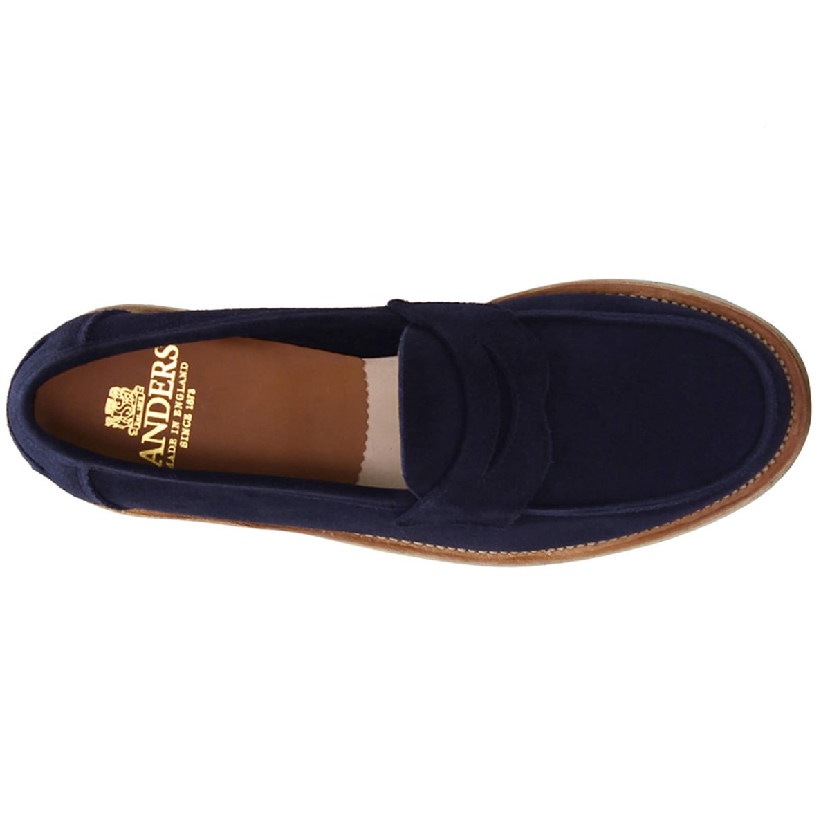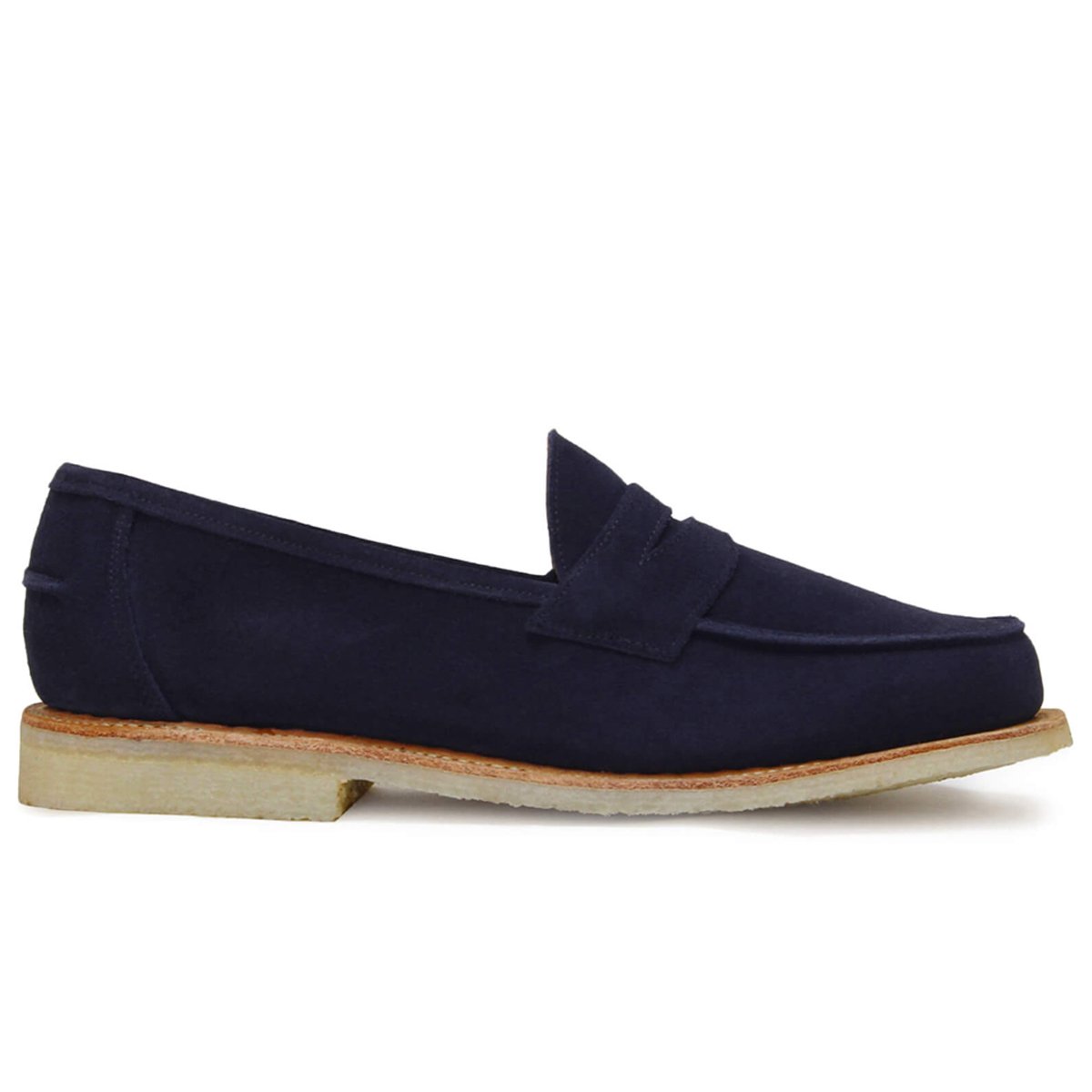 The Sanders Edwin penny loafer is rather unique with it’s natural crepe welted soles. This version has an ocean blue suede upper. Fully leather lined. Style reference 2115AOS