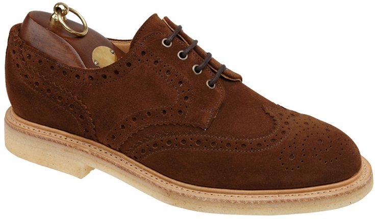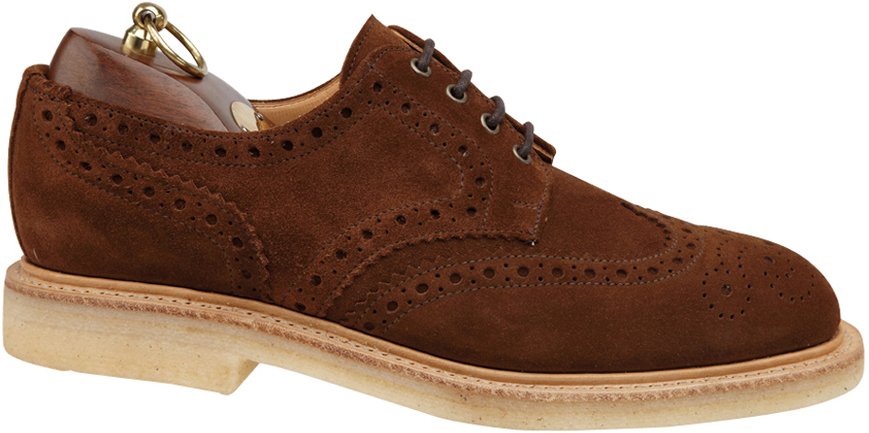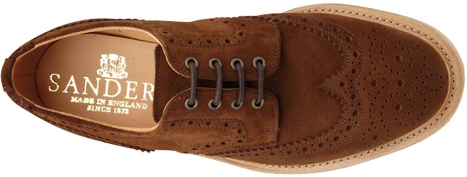 Sanders Olly 8762SS Derby Full Brogue in Snuff Suede from Sanders’ Casual Collection. Full Leather Lining and Leather Insoles. Goodyear Welted Natural Crepe Rubber Soles with Storm Welt Made on the generous F+ 4831 last..