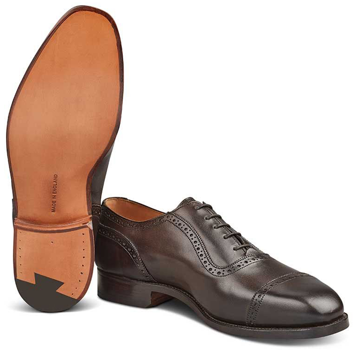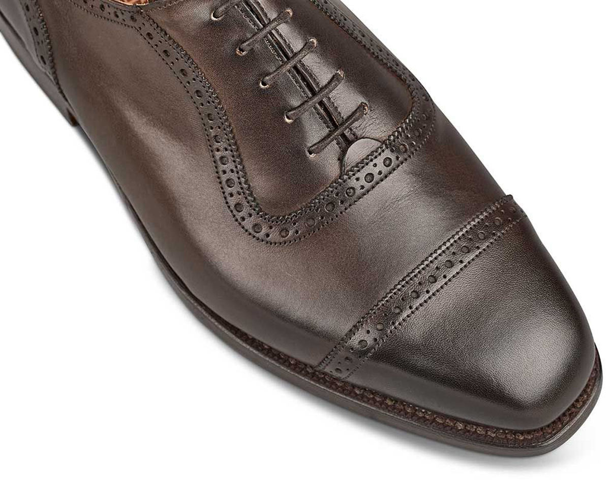 This Tricker’s Belgrave classic toecap Oxford brogue in espresso burnished calf, with blind eyelets for even greater refinement. Leather uppers and linings and stitched and channelled leather sole. Made on the 4537 last.