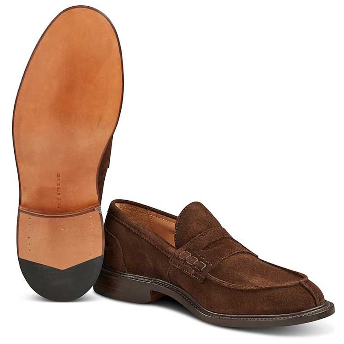 This Tricker’s James step in penny loafer combines comfort with quiet confidence. In chocolate repello suede with leather linings for even greater refinement. Channelled and stitched leather sole. Made on the W2298 last.